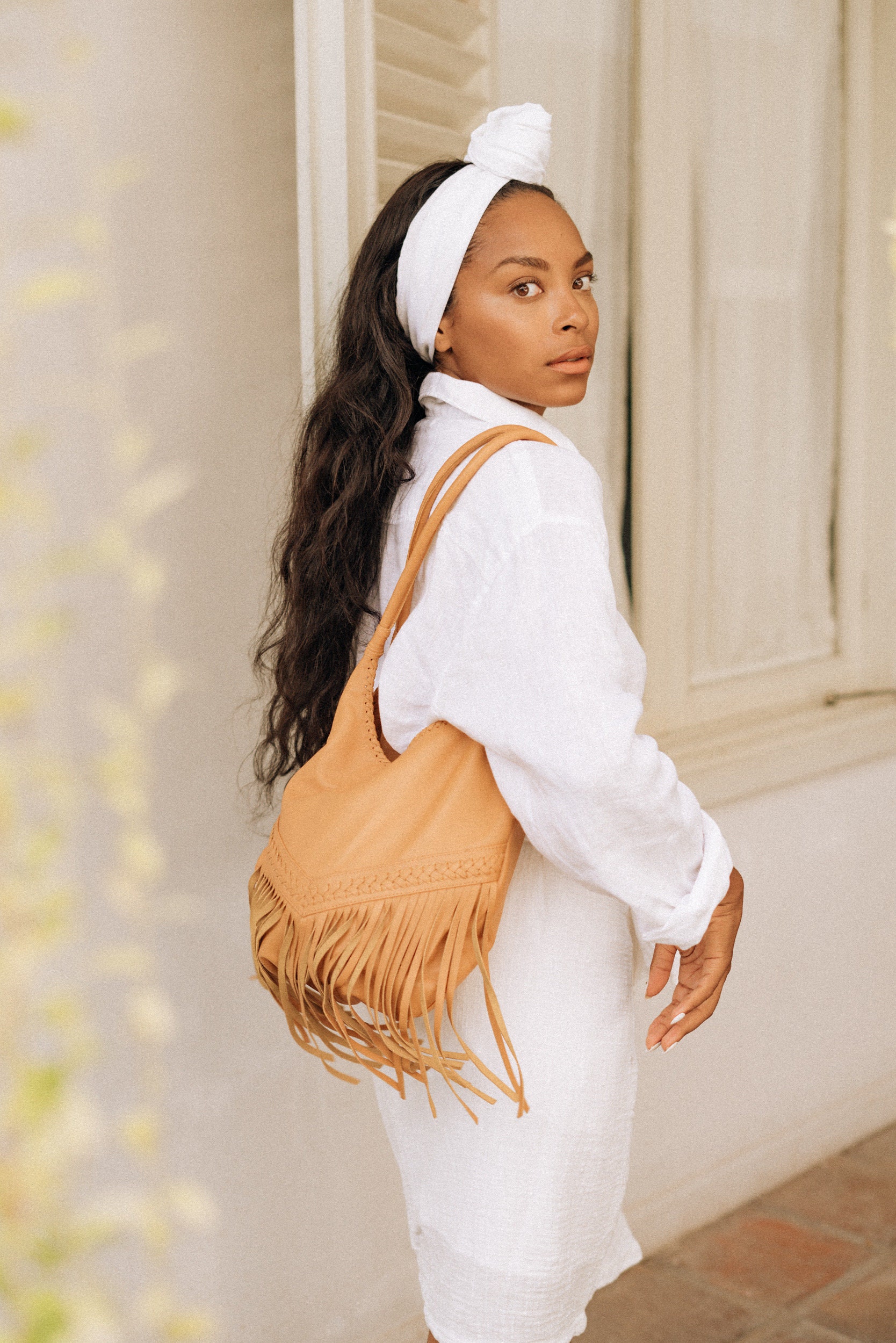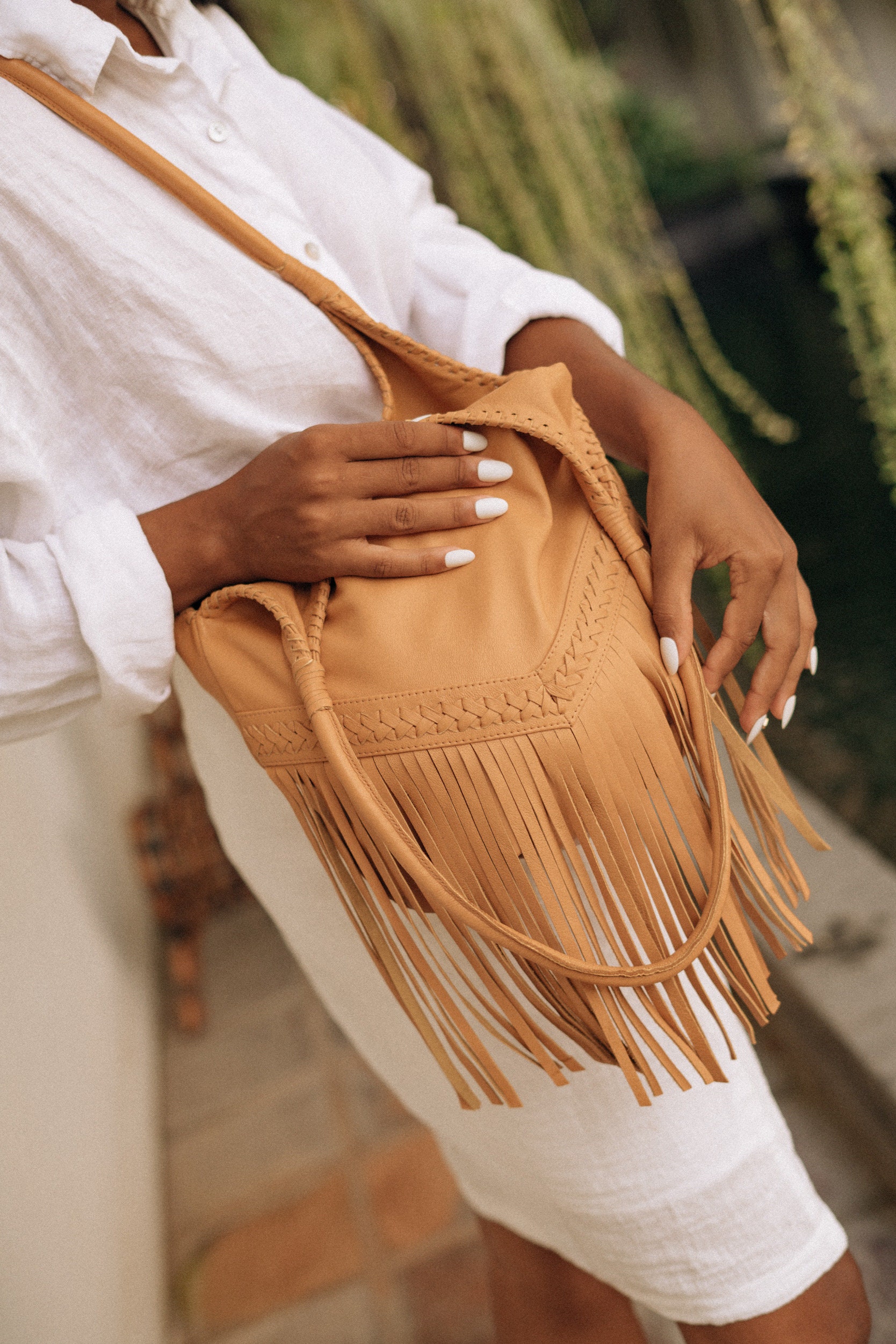 Lily V Tassel Bag Tan leather hand made in Bali.