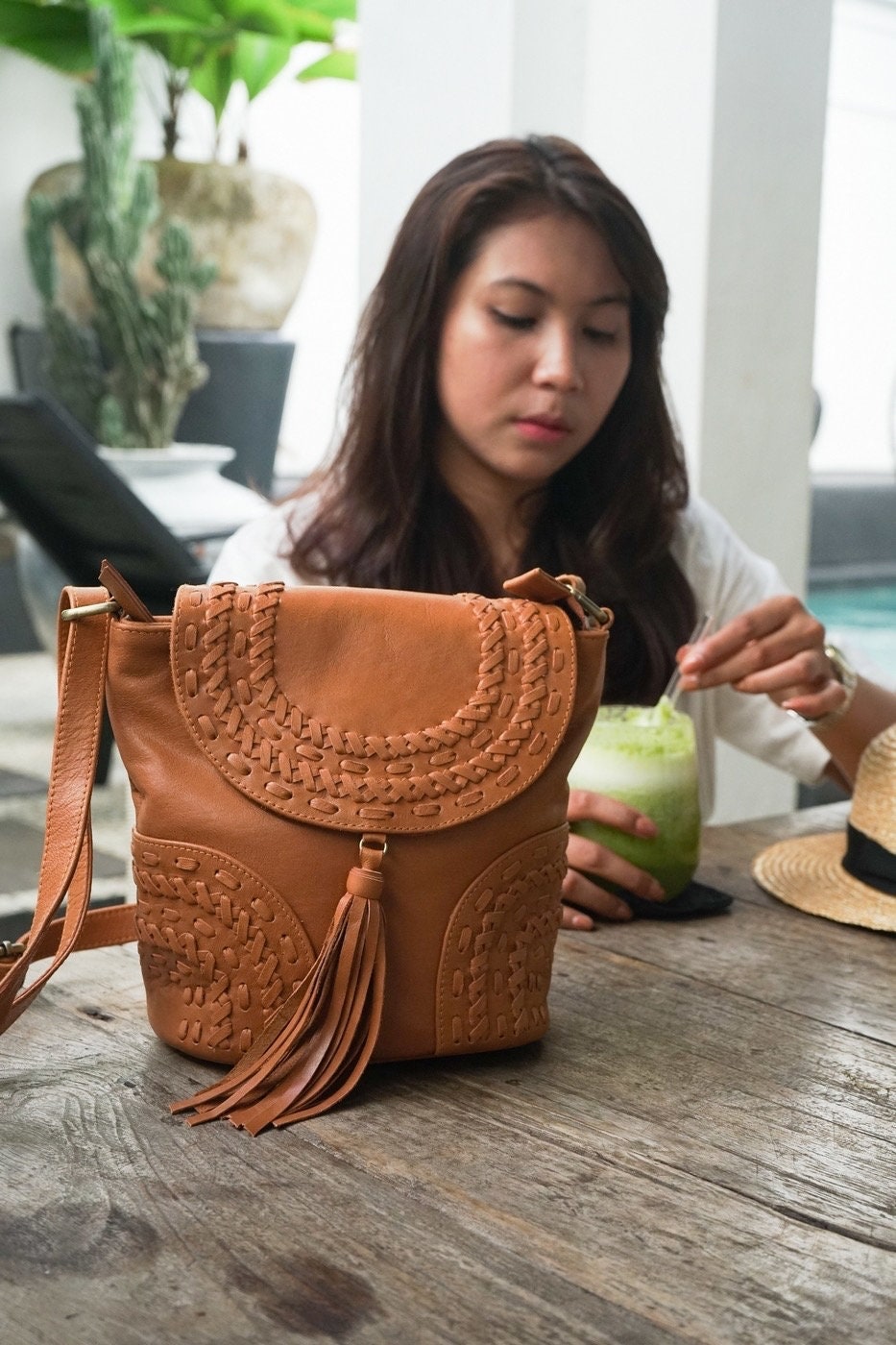 Mandy Mandala Leather Bag Tan leather hand made in Bali.